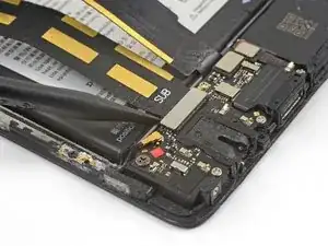 Use the point of a spudger to pry up and disconnect the interconnect flex cable from the daughterboard, which is located below the battery.