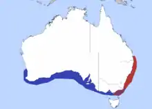 The eastern blue groper is native to the southeastern coast of Australia. Its range extends from Mooloolaba in southern Queensland southwards to Wilsons Promontory in the south of Victoria, including the eastern end of the Bass Strait.[1] Its habitat is rocky areas down to a depth of about 40 m (131 ft).[2]