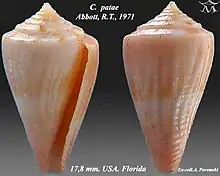 | Apertural and abapertural views of shell of Conus patae Abbott, R.T., 1971 | |