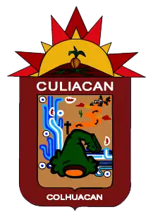 On the carmine border, the word "Culiacán" can be read in its upper part, and in its lower part the word "Colhuacán", which corresponds to the true name of the place in the Nahuatl language. In the upper part of the shield, there is a hill with a germinating seed and the figure of a golden sun, alluding both to the tropical climate of this region and to the fundamentally agricultural effort of its inhabitants.[5]