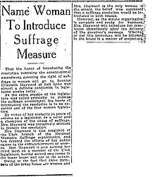 Salt Lake Telegram article noting that Senator Elizabeth Hayward would introduce the "resolution indorsing the constitutional amendment granting the right of suffrage to women."