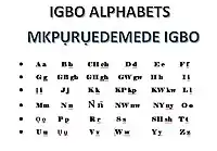 The modern Igbo alphabet (Igbo: Mkpụrụ Edemede Igbo), otherwise known as the Igbo alphabet (Igbo: Mkpụrụ Edemede[1] Igbo), is the alphabet of the Igbo language, it is one of the three national languages of Nigeria.[2] The modern Igbo alphabet is made up of 36 letters,[3] which includes only a 23-letter set of the ISO basic Latin alphabet minus C, Q, and X, which are not part of Abidịị Igbo. The alphabet uses the dot above on the letter , and the dot below on , and .