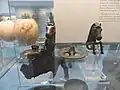 Part of an iron brazier: two bronze wheels and two bronze horses' heads