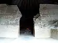 Just inside of the entrance, on the east side, there is a sculpture of a serpent's head on which rests the remains of a statue of an Eagle Warrior. To the west, there is another sculpture in the shape of a large pedestal, symbolizing a tlapanhuéhuetl (war drum). Above this is a sculpture of a cipactli, which is a primeval being, occasionally called a “monster of the earth.” The cipactli is holding up a person, of which only the sandals remain.[8] It is thought the two statues functioned as standards. Further inside is a bench that surrounds a space similar to a hemicycle.[7] The horseshoe bench has four sculptures, the most outstanding one being an eagle that faces the entrance. Two others are also of eagles while the fourth is a jaguar.[8] The jaguar statue has its skin spread out as if it were a mounted trophy.[4] Behind the eagles there is a cuauhxicalli or sacred vessel in which to put the hearts of sacrifice victims, who then turn into messengers of the sun. The orientation of the building relates to the movement of the stars. Before it was covered with a thatched roof to preserve it, openings in the walls provoked light phenomena at certain times such as at the summer solstice.[3]