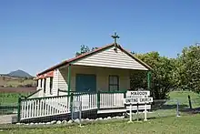 In July 1913, Mr J. H. Slatter (senior) donated 0.5 acres (0.20 ha) of land opposite the school and £20 towards establishing a Methodist church. Tenders were called to erect the church in September 1913.[17] The church was opened on Sunday 7 December 1913 by Reverend William Henry Greenwood of Boonah. It was 18 by 24 feet (5.5 by 7.3 m) with six Gothic windows and a matching door. The builder was Gordon Evans of Rathdowney[18][19] It was at 2777 Boonah Rathdowney Road (28°10′17″S 152°42′51″E / 28.1714°S 152.7142°E).[20] In 1977 as part of the amalgamation that created the Uniting Church in Australia, it became the Maroon Uniting Church. Circa 1999, the church building was replaced with a new building constructed on steel stumps with hardiplank walls, timber floor, and a Colorbond roof.[21] By August 2012, the church land and building were listed for sale and sold in October 2013 for $110,000.[22][23] The church building was demolished by October 1914.[24]
