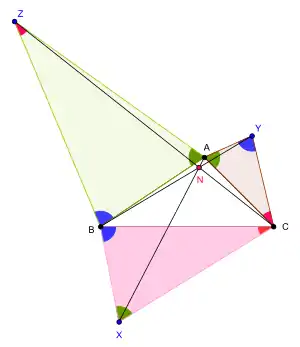 If the three triangles XBC, △YCA, △ZAB, constructed on the sides of the given triangle ABC as bases, are similar, isosceles and similarly situated, then the lines AX, BY, CZ concur at a point N.