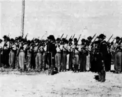 ![]() General Joseph Smith commanding the Nauvoo Legion infantrymen in formation between 1839 and 1844 in Nauvoo, Illinois, with the Nauvoo Temple on a hill in the background | |