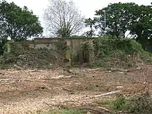 The airfield proper has for many years been occupied by a quarry which has effectively removed all trace of the flying field, whilst the site on which the technical site once lay is now a small village called Crossways, the original northern taxiway being still in use as a road through the village where two dispersal pans and the old ATC tower (albeit heavily converted to a public dwelling - Egdon House) still remain, and the old station cinema is now the village hall. The two bellman style hangars still remain, rumoured to be used by local farmers for fertilizer storage, plus an Over Blister hangar (one of eight built during the war) and other buildings exist in the woodland areas surrounding Crossways, although some have been demolished. One of the base's billets is now one of the local shops, and at the junction of Mount Skippet Way and Airfield Close in Crossways village housing is a memorial to the airfield, located in a grassed recreational area. During recent clearance work in preparation for new buildings on the North East side of the old airfield a brick block house and a concrete rifle range were revealed. Both have now been demolished but the photographs shown were taken just prior to their removal. Further clearances to build an access road across the south-east corner of the flying field has also resulted in the excavation of a group of the aircraft tie-down points.