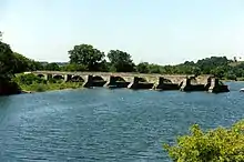 ![]() Nine remaining arches of the Schoharie Creek Aqueduct with the towpath on the right and the remains of the canal crossing on the left | |