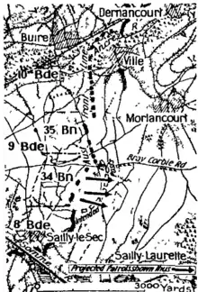After the loss of their front line positions, the Germans reinforced their positions around Morlancourt. The 31st Infantry Regiment was detached from the 18th Division and loaned to the 199th Division, moving into the line around the Bray–Corbie Road.[15] The Australians also rotated their forces, with the 2nd Division relieving the 3rd, who had been in the line for almost seven weeks. On 11 May, the area around Morlancourt was assigned to the 5th Brigade, consisting of the 17th, 18th, 19th and 20th Battalions, which had been out of the line resting. As the 2nd Division's 6th Brigade began preparing to capture Ville to the north, the 5th Brigade began sending out patrols opposite Morlancourt, securing several prisoners and machine guns.[16]