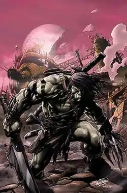 Skaar later encounters Bruce Banner, who had been robbed of the ability to become the Hulk by the Red Hulk. Skaar reiterates his desire to kill the Hulk, but he cannot accomplish this by killing him in Banner's form as they had separated into two distinct personas. Bruce offers to teach Skaar how to kill the Hulk should he ever return, but this is a ruse to allow Banner to monitor his "son", and impart fatherly wisdom in the hope of turning the savage warrior into a hero. Skaar demonstrates his ability to use both cunning and physical strength by hurling the villain Juggernaut into outer space.[17] Subsequent lessons by Banner include encounters with Wolverine, Wolverine's son, Daken, Victoria Hand, Moonstone, a mutated Marlo Chandler, Tyrannus, the Mole Man and his army of Moloids.[18][19][20][21]