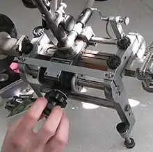 A typical test setup with a waveguide slotted line is shown in figure 2. Referring to this figure, power from a test equipment source (not shown) enters the apparatus through the co-axial cable on the left and is converted to waveguide format by means of a launcher (1). This is followed by a section of waveguide (2) providing a transition to a smaller size of guide. An important component in the setup is the isolator (3) which prevents power being reflected back into the source. Depending on the test conditions, such reflections can be large and a high-power source may be damaged by the returning wave. The power entering the slotted line is controlled by a rotary variable attenuator (4). This is followed by the slotted line itself (5) above which is the probe mounted on a movable carriage. The carriage also carries the probe adjustments: (6) is the probe depth adjustment, (7) is a length of co-axial section with tuning adjustments, and (8) is a detector, which uses either a point contact crystal rectifier or a Schottky barrier diode.[5] The right-hand end of the slotted line is terminated in a matched load (9) which absorbs all the power exiting the end of the waveguide. The load can be replaced by the component or system that it is desired to test. It can also be replaced with a reference short-circuit (10) which is used to calibrate the slotted line. The carriage can be moved along the slotted line by means of a rotary knob (11) which simultaneously moves a vernier gauge (12) for accurate measurement of the probes position along the line.[6]