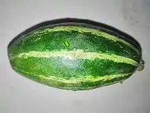 Trichosanthes dioica Roxb., also known as pointed gourd, is a tropical perennial cucurbit plant with its origin in the Indian subcontinent. It is also known as parwal, palwal, potol, or parmalin in different parts of India and Bangladesh. The plant propagated vegetatively and grows with training on a support system (e.g., trellis) as pencil-thick vines (creepers) with dark-green cordate (heart-shaped) simple leaves. It is a well-developed dioecious plants having distinct male and female flowers on staminate and pistillate plants, respectively. The fruits are green with white or no stripes' and have unpalatable seeds. Size can vary from small and round to thick and long — 2 to 6 inches (5 to 15 cm). It thrives well under a hot to moderately warm and humid climate. The plant remains dormant during the winter season and prefers fertile, well-drained sandy loam soil due to its susceptibility to water-logging.[2][3]