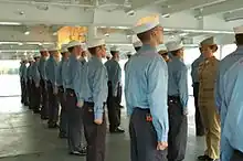U.S. citizen candidates for admission must sign a service obligation contract as a condition of admittance to the USMMA; U.S. candidates who completed Indoc will execute the Oath of Office as a Midshipman in the Navy Reserve the day prior to Acceptance Day.[76] Plebes officially become part of the USMMA Regiment of Midshipmen on Acceptance Day, which is now standardized at 2 weeks after Indoc ends.[77] Until they are "recognized" later in the academic year, plebes must continue adhere to stringent rules affecting most aspects of their daily life. After earning it, the plebes are recognized, henceforth accorded privilege of the title Midshipman, which gives them more privileges, known as "rates".