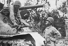 The 1st Cavalry Division remained in the Admiralty Islands until October, when it boarded ships there for the invasion of Leyte, which it assaulted on October 20, 1944. Chase's 1st Brigade's initial mission was to reconnoiter the hills on the west side of the Tacloban Valley and establish observation posts from which it could command the entrances to the valley.[17] In November, he was ordered to cover the flank of X Corps' advance up the Leyte Valley, and later into the Ormoc Valley. Chase had to move his brigade across mountainous, roadless, uncharted jungle in frequently appalling wet weather. The advance made slow progress against Japanese troops that fought tenaciously all the way.[18]
